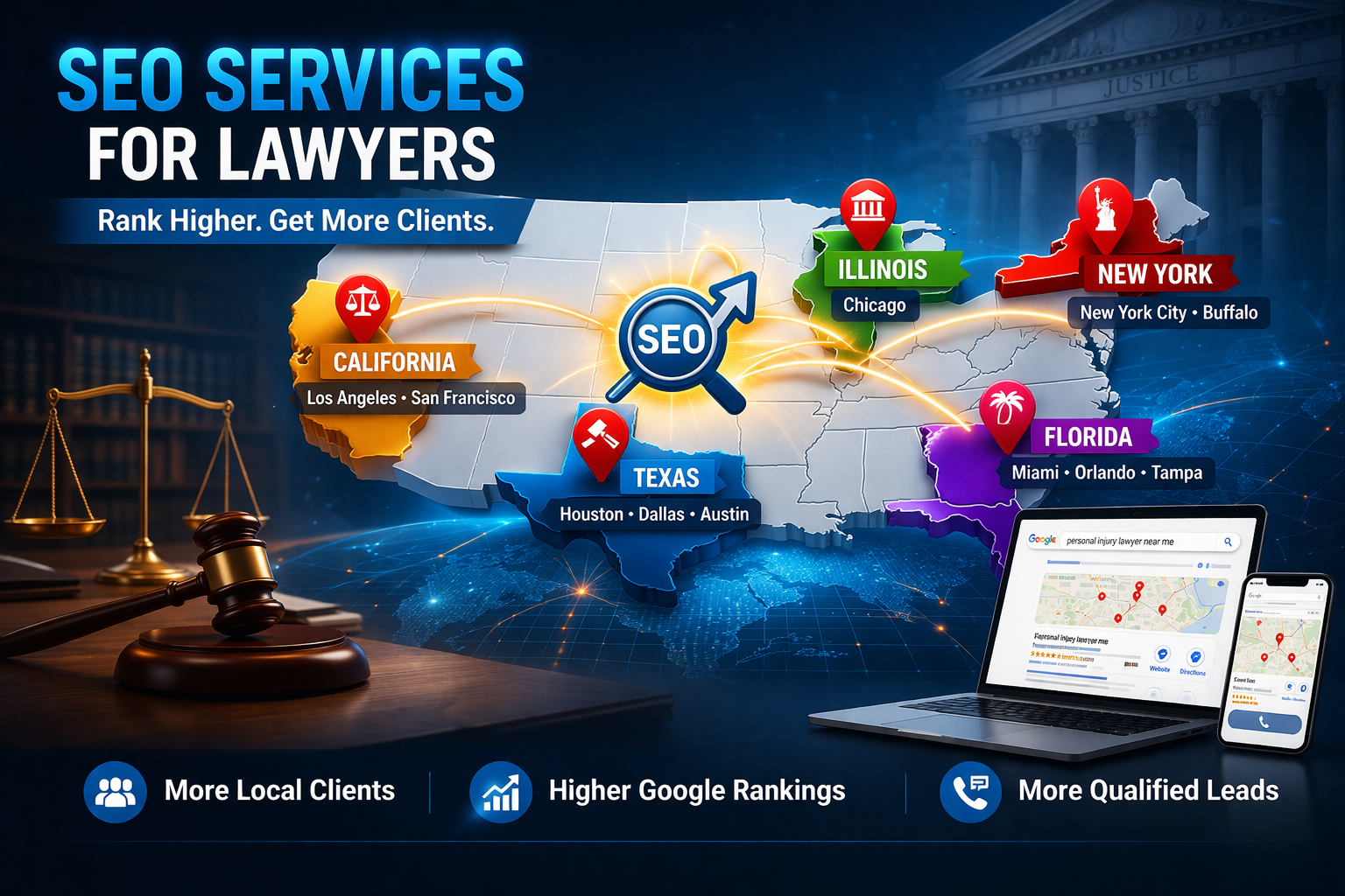 Whether you are targeting Texas, New York, California, Florida, or Illinois, the right lawyer SEO strategy can help you: